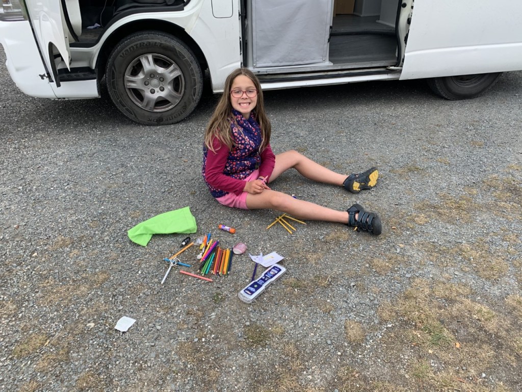 Hi, today was super mega awesome spectacular because me and Immy saw killer whales. We drew in our note books because it was raining. Then we had to go. We drove a long way to Invercargill. At the campground I made a friend named Strawberry, she’s a cat and I gave her milk. We painted rocks and hid them. It was awesome!